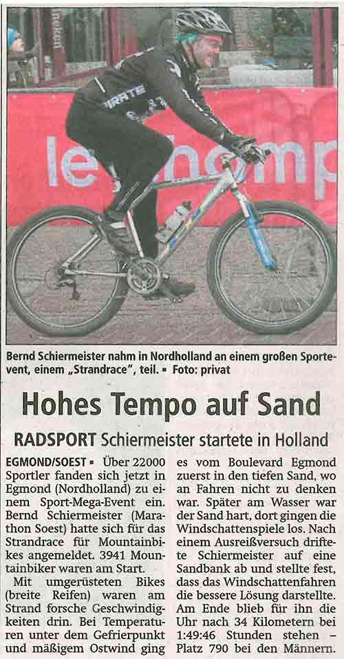 Am kommenden Samstag hat Bernd Schiermeister in Niederense etwas vor, was allerdings nichts mit Moto-Cross zu tun hat. Aber auch beim „Triathlon in Niederense“ sind beste körperliche Verfassung und viel Ausdauer gefragt. Treffen zu der Pilotveranstaltung, die wie bei jedem Triathlon Schwimmen, Radfahren und Laufen beinhaltet, ist am 10. Dezember um 14 Uhr auf dem Niederenser Schulhof...