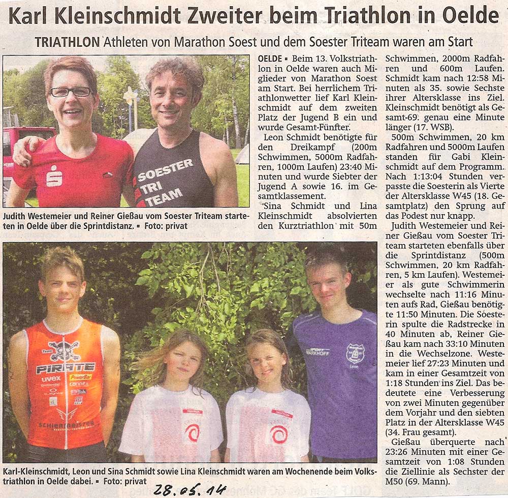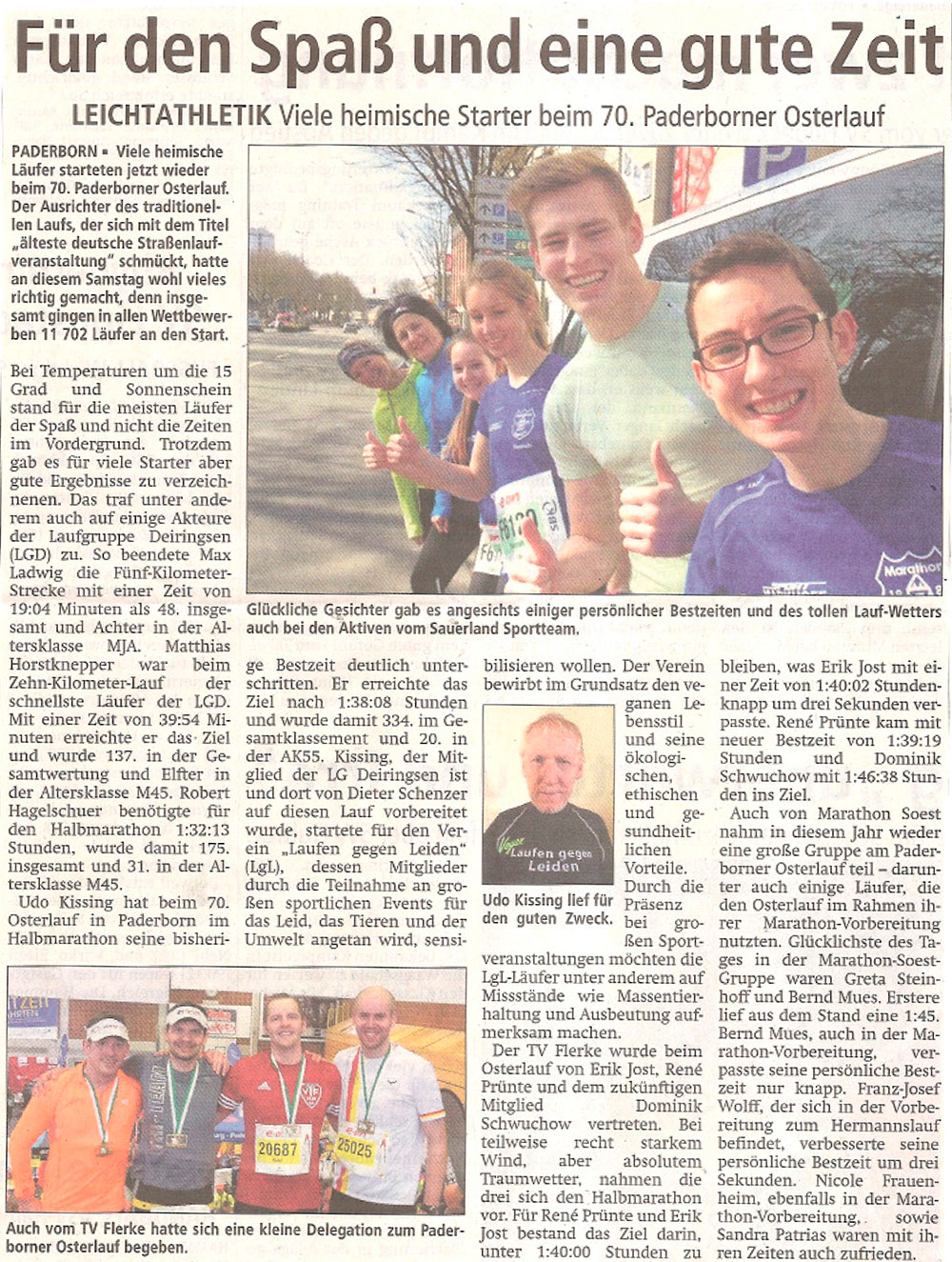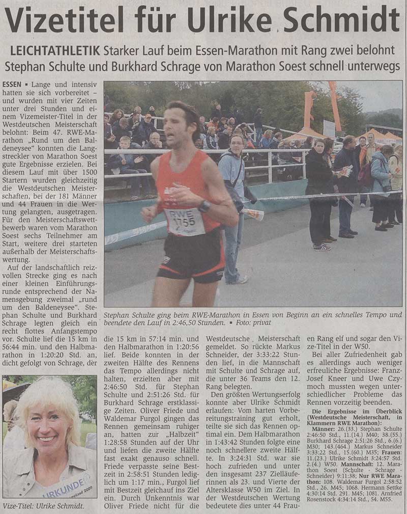 Männer: 26. (33.), Stephan Schulte 2:46:50 Std., 11. (14.) M40; 38. (55.) Burkhard Schrage 2:51:26 Std., 6. (6.) M30; 143. (464.) Markus Schneider 3:33:22 Std., 15. (60.) M35; Frauen: 11. (23.) Ulrike Schmidt 3:24:57 Std. 2. (4.) W50. Mannschaft: 12. Marathon Soest (Schulte – Schrage – Schneider) 9:11:38; Nur RWE Marathon: 108. Waldemar Furgol 2:58:52 Std., 26. M45; 1068. Hermann Settke 4:30:14 Std. 291. M45: 1081. Arnfried Rosenstock 4:34:14 Std., 54. M55.