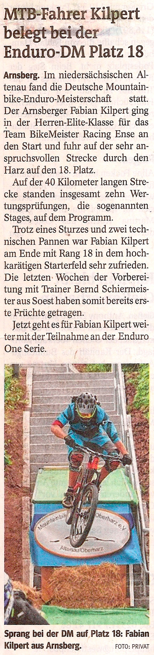 Am vergangenen Wochenende fand im Fichtelgebirge am Ochsenkopf der 4. Lauf zur Enduro One Serie statt. Ralf Geisen und Fabian Kilpert waren für ihr BikeMeister Racing Team aus Niederense auch am Start. Das steile, verblockte und sehr ruppige Terrain hat nicht nur den Fahrern fahrtechnisch alles abverlangt. Ihre Bikes wurde auch sehr hart auf die Probe gestellt. Hier galt es eine perfekte Linienwahl zu treffen, um nicht mit kaputten Reifen oder einem abgerissenen Schaltwerk auszufallen. Der Veranstalter hatte die Gesamtstrecke mit Absicht nur auf ca. 20km ausgewählt, damit den Teilnehmern noch genügend Energie blieb, um voll konzentriert die 5 Stages (Wertungsprüfungen, Stages) zu absolvieren. Ralf und Fabian kamen mit der Strecke wunderbar zu Recht und sie hatten eine Menge Spaß. Sie konnten beide das Rennen sturzfrei und ohne technische Probleme beenden. Ralf Geisen belegte so in der Mastersklasse Ü35 einen sehr guten 10. Platz und schaffte somit noch knapp den Sprung in die Top 10. Fabian Kilpert startete in der Klasse Sport und belegte einen sehr starken Platz 6 und wurde bei der Siegerehrung noch ausgezeichnet. In den nächsten Tagen werden sie sich mit ihrem Trainer Bernd Schiermeister aus Soest auf den Finallauf der Enduro One Serie mit Technik-Training vorbereiten.