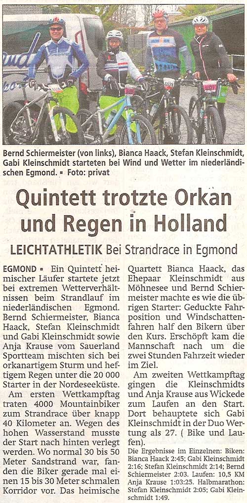 In Halver entschied sich Schiermeister, der vor einem Jahr einen Schlaganfall erlitten hatte und sich durch Reha-Maßnahmen, viel Besonnenheit und großen Willen zurück auf die Sport-Bühne kämpfte, für den Sprintwettbewerb. Hier konnten Mannschaften oder Einzelstarter gemeldet werden. Zu absolvieren waren 3,5 Kilometer Geländelauf, 9 Kilometer Mountain-Biken und dann wieder 3,5 Kilometer Crosslauf. Das Gelände war teils schlammig aber dennoch gut befahrbar. Knackige Anstiege machten vor allen Dingen in den Laufpassagen Mühe.