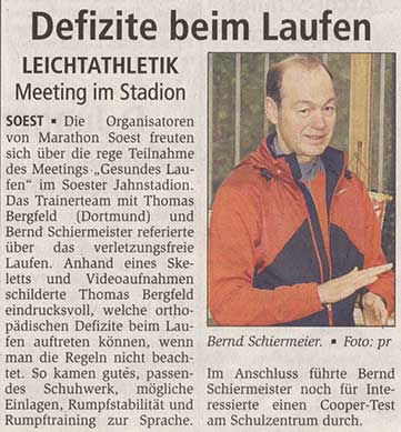 SOEST • Die Organisatoren von Marathon Soest freuten sich über die rege Teilnahme des Meetings „Gesundes Laufen“ im Soester Janhstadion. Das Trainerteam mit Thomas Bergfeld (Dortmund) und Bernd Schiermeister referierte über das verletzungsfreie Laufen. Anhand eines Skeletts und Videoaufnahmen schilderte Thomas Bergfeld eindrucksvoll, welche orthopädischen Defizite beim Laufen auftreten können, wenn man die Regeln nicht beachtet. So kamen gutes Schuhwerk, mögliche Einlagen, Rumpfstabilität und Rumpftraining zur Sprache. Im Anschluss führte Bernd Schiermeister noch für Interessierte einen Cooper-Test am Schulzentrum durch.