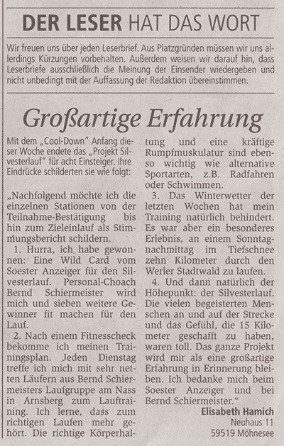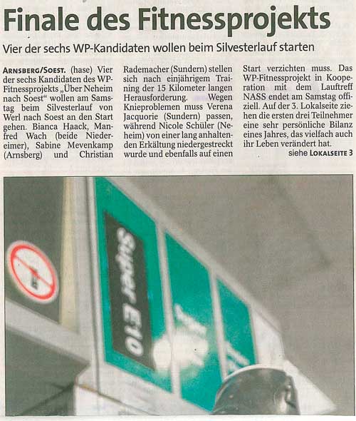 Leistungsdiagnostik mittels Spirioergometrie und Höhentraining (ein Training in sauerstoffreduzierter Luft) sind die nächsten Bausteine. Hier arbeitet Schiermeister eng mit dem sportwissenschaftlichen Institut "Höhenbalance AG" in Köln zusammen. Interessierte können sich vor dem Silvesterlauf in der Stadthalle Werl informieren. Das Live Training für das Radio ist aufgezeichnet worden. Nach einer Laufeinheit ging es ins Maifeld, wo beim Geräte-Training ein Interview über die Motivation anstand. Nähere Infos unter www.personal-trainer-soest.de