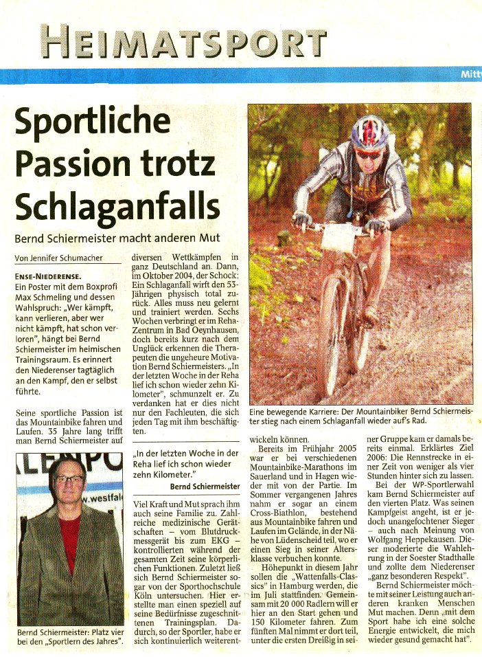 Seine sportliche Passion ist das Mountainbike fahren und Laufen. 35 Jahre lang trifft man Bernd Schiermeister auf diversen Wettkämpfen in ganz Deutschland an. Dann im Oktober 2004, der Schock: Ein Schlaganfall wirft den 53-Jährigen physisch total zurück. Alles muss neu gelernt und trainiert werden. Sechs Wochen verbringt er im Reha-Zentrum in Bad Oeynhausen, doch bereits kurz nach dem Unglück erkennen die Therapeuten die ungeheure Motivation Bernd Schiermeisters. „In der letzten Woche in der Reha lief ich schon wieder zehn Kilometer“, schmunzelt er. Zu verdanken hat er dies nicht nur den Fachleuten, die sich jeden Tag mit ihm beschäftigen.
